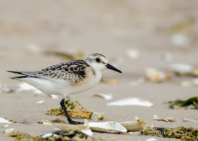 | A sanderling explores among the fragments of shells and seaweed. |